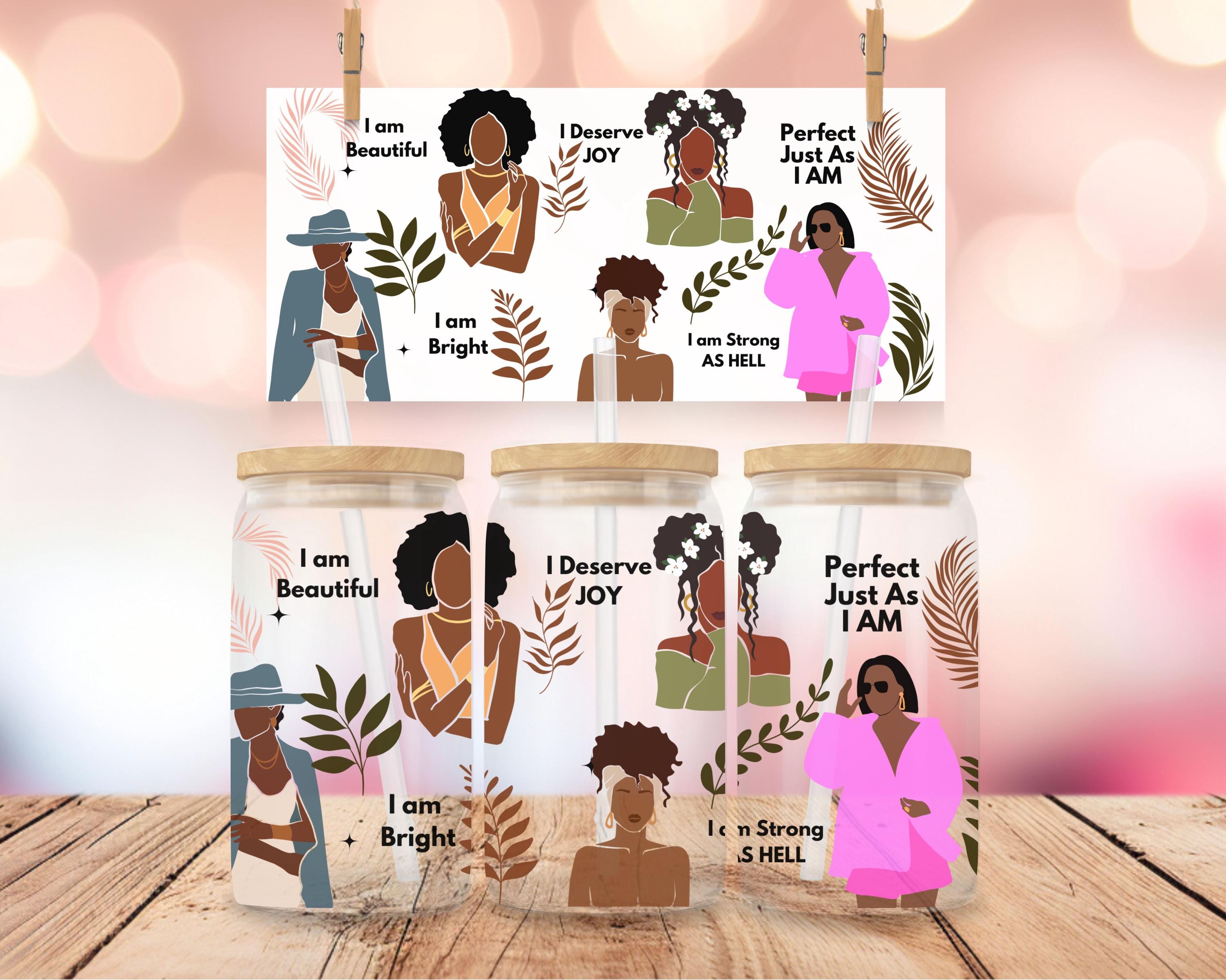 Sip in style and confidence with our Positive Affirmations16oz Can Glass Tumbler, featuring stunning artwork of fashionable Black women radiating beauty, grace, and bold self-expression. Each illustration captures the essence of melanin elegance.